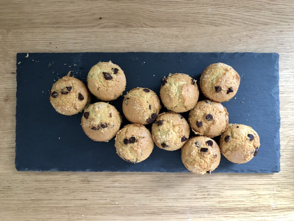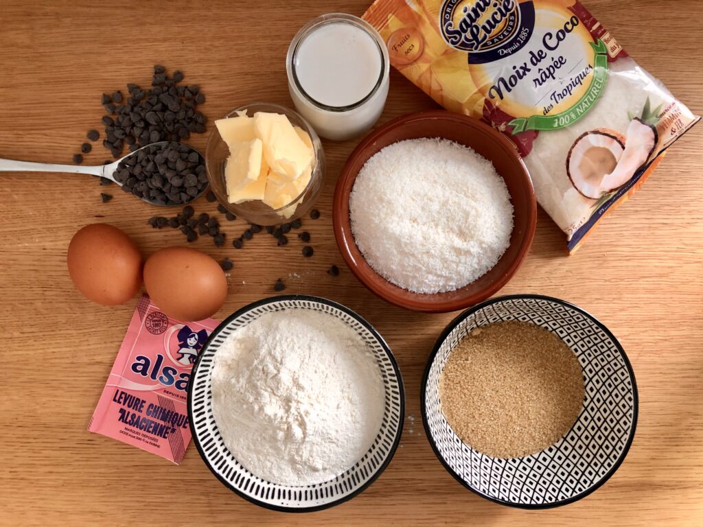 – Répartir la pâte dans les moules puis décorer avec les pépites de chocolat restantes et un peu de noix de coco râpée en plus. Faire cuire pendant 20 minutes.