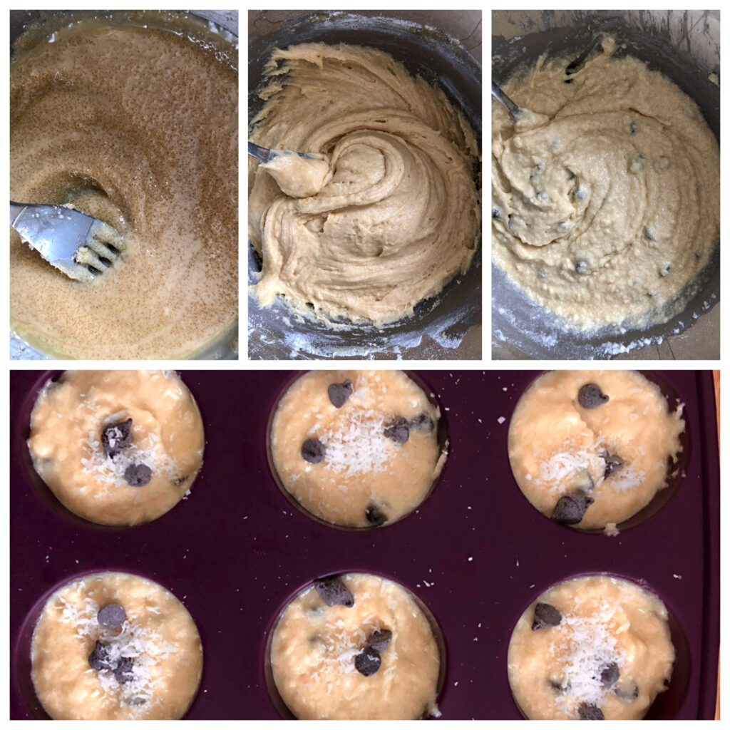 – Ajouter le lait d’amande, la noix de coco râpée et mélanger. Incorporer les pépites de chocolat (on peut en garder quelques unes pour décorer).